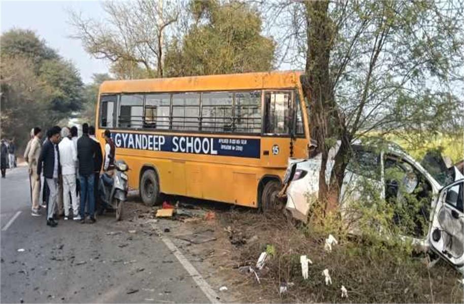 हादसा उस समय हुआ जब स्कूल बस बच्चों को लेकर स्कूल की ओर जा रही थी। स्कूल से निकलने के कुछ ही दूरी पर अचानक संतुलन बिगड़ने से कार कई बार पलटी खा गई, वहीं स्कूल बस सड़क किनारे पेड़ से जा टकराई। टक्कर इतनी भीषण थी कि कार के परखच्चे उड़ गए और बस पेड़ में धंस गई। हादसे में कार सवार गांव जैतडावास निवासी करीब 25 वर्षीय जितेंद्र और सचिन की दर्दनाक मौत हो गई। दोनों युवक एनएच-48 से अपने गांव की ओर लौट रहे थे। वहीं बस में सवार बच्चों को मामूली चोटें आई हैं, जबकि बस चालक को गंभीर चोटें लगने के कारण अस्पताल में भर्ती कराया गया है।